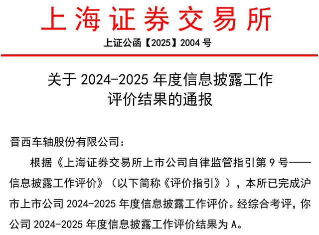 日前,上海證券交易所公布2024-2025年度滬市上市公司信息披露工作評(píng)價(jià)結(jié)果,晉西車軸憑借規(guī)范嚴(yán)謹(jǐn)?shù)闹卫砑軜?gòu)與精準(zhǔn)高效的信息披露實(shí)踐,成功獲評(píng)最高等級(jí)A級(jí)。這一榮譽(yù)不僅是對(duì)公司在信息披露、公司治理、規(guī)范運(yùn)作及投資者關(guān)系管理等領(lǐng)域工作的高度認(rèn)可,更凸顯了公司在資本市場(chǎng)中的優(yōu)質(zhì)形象。本次評(píng)價(jià)覆蓋2263家滬市上市公司,獲評(píng)A類比例為19%。